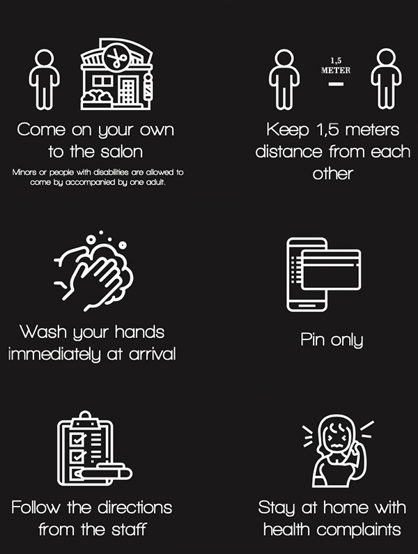 - A number of treatments will temporarily not be done due to the hygiene protocol: express bar, gents retouch, children under 12 years and pony cut only (As soon as more time is available, we will offer these treatments again).